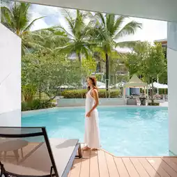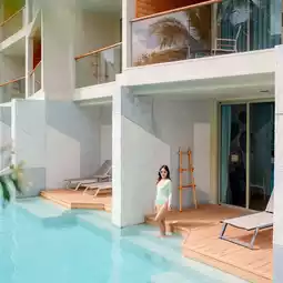 This hotel is beautiful and has many cool photo spots. It will please those who love relaxing by the pool and those who love swimming because there is a swimming pool surrounding the hotel. There are many types of rooms, including garden views, lagoon views, and pool views. Our room had a pool view. You can open the back door and walk down to the pool to chill.