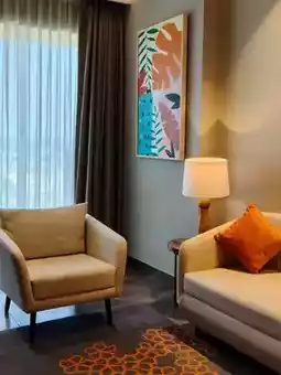 With a sitting area by the window, a soft sofa, a small work desk, and complete amenities.