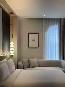 A hotel with a warm minimalist design in white and wood tones that instantly gives a comfortable feeling upon entering.