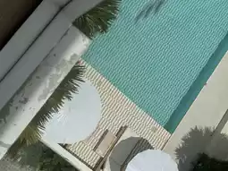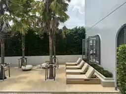 The white-cream pool daybed corner, contrasting with the palm trees and white walls, is great for taking pictures. No matter how sunny it is, you won't be afraid because there are white umbrellas to hide from the sun. There is also a cold drink service. For those who want to relax without doing anything, just chilling by the pool is awesome.