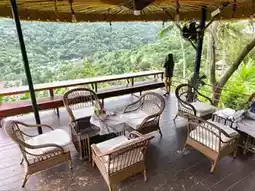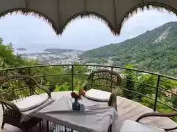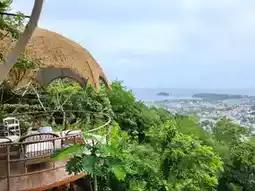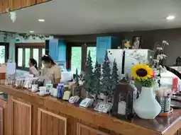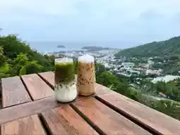 Atmosphere and location - A cafe on a mountain. The view overlooks the city, houses, hotels, the sea on Kata Beach and the mountains, the next mountain, which is a mountain with a large white Buddha statue. The cafe is decorated in a flower farm style. In the trees There are both indoor and outdoor seating areas. In the indoor area, there are tables and chairs in front of the counter and another area is a glass house decorated with climbing plants that are flowers. Let's come down from the ceiling. On the roof of the indoor area is an open space on the roof to go up and see the view. As for the outdoor area, there is a bar facing the mountain and seats in the dome, which is a photo spot of the cafe. The surrounding area is decorated with all wooden furniture. It gives an atmosphere surrounded by nature. There is a flower garden. Climbers hang down between the walkways. There is a tree house. Walk up to see the view