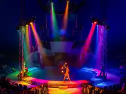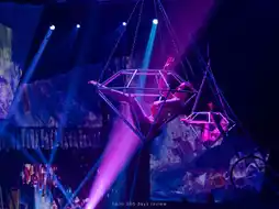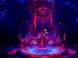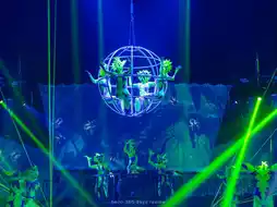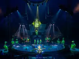 A large scene in the middle of a 360-degree water stage, dazzling with a performance of light, color, sound, and many actors both on stage, underwater, and in the air, making the audience feel like they have truly entered the underwater world.