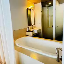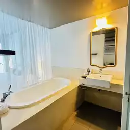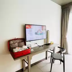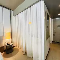 The hotel rooms are decorated in warm tones, spacious, and clean, offering a luxurious feel. Each room features a see-through bathtub with a privacy curtain. The Pool Access Room allows direct access to the swimming pool from the room's balcony. Room amenities include air conditioning, a minibar, a safe, and free Wi-Fi.