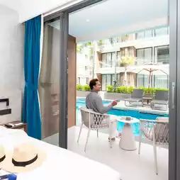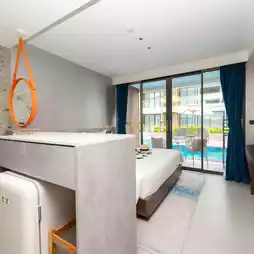 A luxurious room by the poolside, you can access the pool from the balcony.