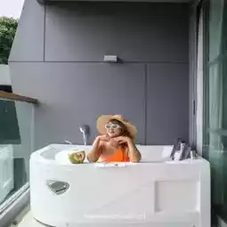This time, Phi Jeans stayed in the 𝗦𝗜𝗦 𝗢𝗩𝗘𝗥 𝗧𝗛𝗘 𝗦𝗘𝗔 room. The bed is very soft and comfortable. The bathroom is separated, which is great. This room comes with a full view of the sea and the swimming pool. Plus, there's a spa tub on the balcony. So cool! 🛁