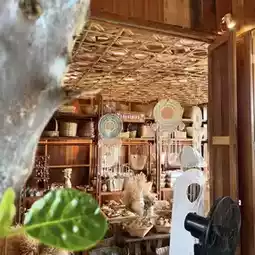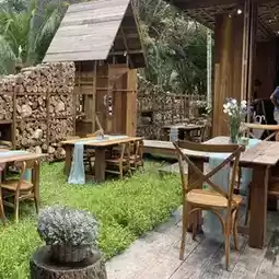 – Combining Rustic + Tropical styles 🪴 Wooden tables, rattan chairs, small bird's nests in the wooden fence.