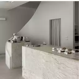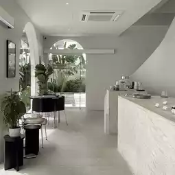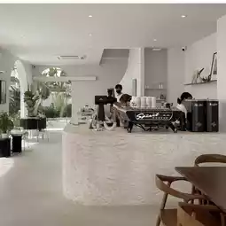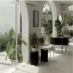 • Modern design in white and wood tones with curved glass doors that are very airy and spacious. The ground floor is a cafe, the second floor has a small meeting room, and the third floor is an open-air workshop.