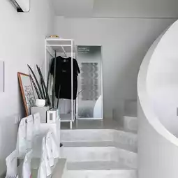 • The shop is bright white, contrasting with wooden furniture, giving a warm and simple feel