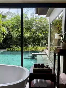 🌴【Design Style】: The hotel centers around "Modern Thai Zen" as its design core. The lobby features towering wooden domes paired with cascading crystal chandeliers, while the hallways showcase Southern Thai handcrafted wood carvings and textiles. Each room comes with a private pool or terrace—sliding open the floor-to-ceiling windows reveals turquoise waters and white sand. Interiors feature rattan furniture and natural linen fabrics, with hand-painted wave patterns adorning the headboards, exuding island relaxation in every detail. Public areas are surrounded by lush tropical greenery, with pools seamlessly connecting to the beach. At sunset, sitting in a thatched cabana, you can watch the sea painted in orange-red hues.