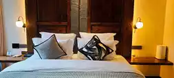 The cafe is arranged like a camping zone with wooden beds, mats, pillows, and hammocks tied to trees.