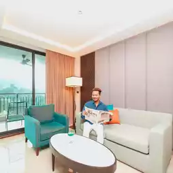 A one-bedroom suite with a view of the pool and the sea.