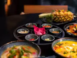– And a set of royal side dishes, served on a round wooden tray with exquisite fresh flowers as a decoration