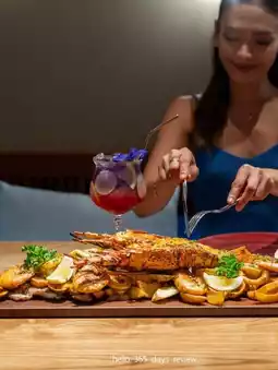 🦞 The highlight is the “Seafood Platter”, which is packed with giant grilled lobster, tiger prawns, grilled fish, sweet clams, and side dishes such as french fries, fried cheese, and a variety of sauces to choose from.