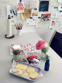 The warm wooden tables, soft music, and the air waft through one wall, are lined with brushes, paints, and other random works, seemingly intentionally placed there for you to gaze upon and immerse yourself in.