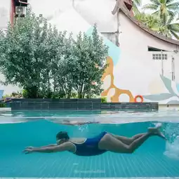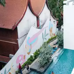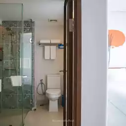 This room has a glimpse of the pool below. There's a hammock for lounging on the balcony. The bed is comfortable. I slept so well I woke up late again. 😁 There's a work area. The bathroom has separate dry and wet areas.