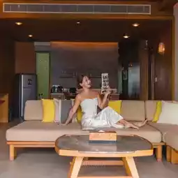 May chose a penthouse room🏡, which opens onto a private pool villa from the balcony. The room is very spacious, divided into a living room, dining table, and kitchen area. Everything is fully equipped and luxuriously decorated. There's a well-proportioned reclining sofa. Inside, there's a bedroom with a stylish round bed that's comfortable to sleep on. The bathroom is also spacious. I absolutely love it!