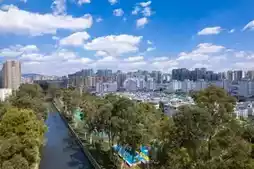 The swimming pool includes a kids' pool, a large pool, and a giant slide. The highlight is the sunbeds by the beach, perfect for sunbathing and enjoying the stunning sea view. Truly a blissful experience!