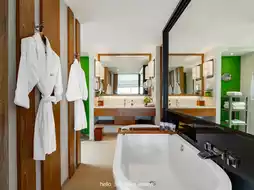 From the moment you step into the lobby, you're greeted by tranquility and excellent service from the staff. The spacious rooms feature private balconies with panoramic views of the Andaman Sea. Highlights include vibrant green daybeds adorned with vibrant pink bougainvillea flowers, perfect for lounging and enjoying the breeze all day. The large, comfortable beds offer a comfortable sitting area for reading, and the spacious bathroom features a bathtub perfect for a relaxing soak.