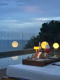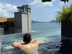 The hotel's perch offers unobstructed ocean views. Open your door to your private jacuzzi and enjoy the shared curved swimming pool. Downstairs, you'll find an infinity pool with a bar, where a friendly bartender can whip up a special island cocktail. Just a ten-minute drive from Patong Beach, it offers a tranquil escape amidst the bustle of the city, offering ultimate privacy.