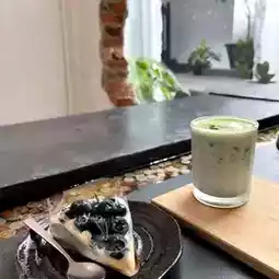 Homemade drinks and desserts like matcha latte and young coconut cake.