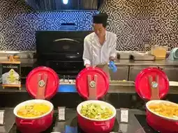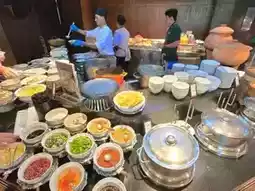 A grand buffet line featuring Thai, Chinese, and international cuisine, along with live cooking stations for fresh eggs and omelets, aromatic baked goods, and fresh fruits. Plus, the restaurant offers a breezy view for a relaxing dining experience.