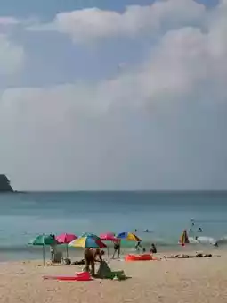 📝: Beautiful beach with lots of surfers and a beautiful setting. Tourists enjoy water activities, sunbathing, relaxing, and strolling along the beach. Overall, the beach is well-maintained. Parking is available, but not very crowded. Highly recommended. There are also street food vendors. If you're hungry, you can grab a bite to eat.
