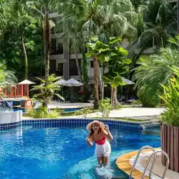 The resort offers a lush tropical atmosphere with two large swimming pools and a long waterslide for kids to enjoy all day, while adults can relax and enjoy a drink by the pool. 🍹