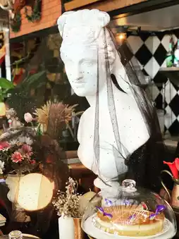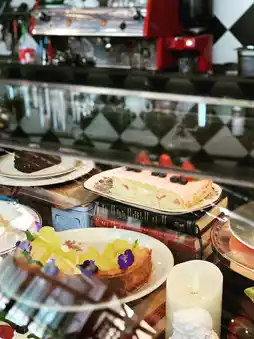 The interior has two levels of seating. The lower level is a spacious hall, while the upper level is a spiral staircase leading to a mezzanine. It can get a bit hot because it's near the roof. Next to it is the food counter. There's a wide selection of teas, coffees, and a variety of cakes. There's also homemade ice cream in various flavors, all frozen in a display case. If you're feeling hungry, you can order a meal. There's a wide selection to choose from. 🍰