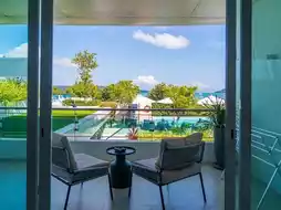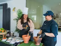 😎 The rooftop also features a swimming pool with sea views and Chalong Pier, as well as a fitness center. Cooking classes are also available, including evening movies on the rooftop, stargazing, and the relaxing sea breeze. There's also a free shuttle bus to and from Nai Harn and Rawai Beaches daily. If you're hungry, head to Bay Ground Bistro, which offers all-day dining and a breakfast buffet with a variety of simple options. Or you can walk to the convenience store at the entrance of the alley, where there's a 7-11.