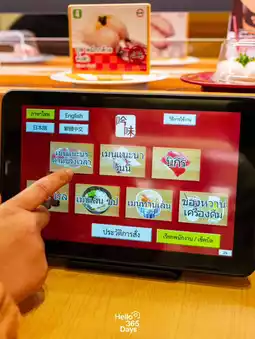 The conveyor belt sushi comes with an easy-to-use tablet ordering system in Thai, English, Japanese, and Chinese. Choose your favorite menu items or choose individual dishes from the conveyor belt, and your sushi will be brought to you right in front of you. No wait!