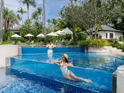 - The main pool is a must-see. The infinity pool offers sweeping views of the azure sea, a spot everyone is sure to take home stunning photos of. If you're worried about the heat, the garden pool, shady among the coconut trees, features a waterfall pool and glass windows, perfect for taking chic photos.