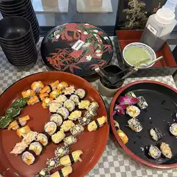 Kimchi, seaweed salad, sushi, rice vermicelli with curry sauce, a variety of dipping sauces to choose from