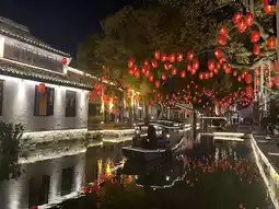 when the moon is on the willow tip, the red lanterns are high, reflected in the water, like stars.