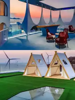 🔸The rooftop infinity pool, even without neon lights, offers a luxurious experience. The offshore wind turbines and sunset in the distance add a natural filter, satisfying any desire for a tranquil escape!