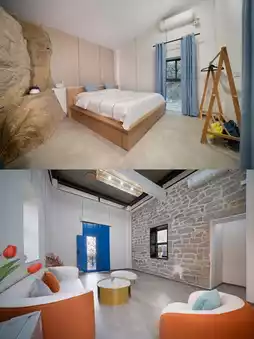 The rooms are a dream come true! Wooden decor + stone walls, with a large balcony framing the sea view like a painting.