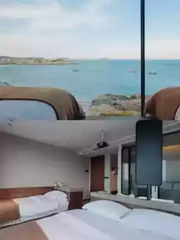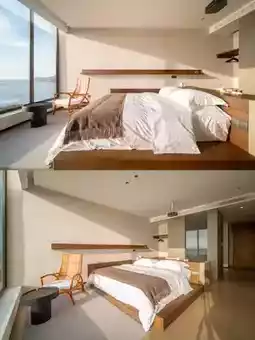 The room perfectly matches my aesthetic! Huge floor-to-ceiling windows facing the sea, waking up to the sunrise spreading over the ocean, pink-golden light spilling onto the bed, even staying in bed becomes a pleasure~