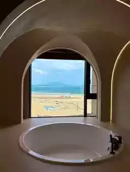 The most stunning feature is the room with a sea view bathtub! The arched design + built-in bathtub, soaking in warm water and lifting your eyes, the whole sea crashes right into your sight. Watch the sunset in the evening, stargaze at night, so romantic you want to scream!