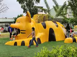 The park features many large animal-shaped play structures, including a two-story dinosaur slide, a giant Shiba Inu slide, an elephant triple-slide, a cat slide, a whale slide, a sparrow pipe slide, a caterpillar tunnel, and mini slides shaped like an octopus and a crocodile. Even toddlers can enjoy the fun here.