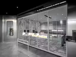 Inside the chocolate workshop, the glass window design looks like a European factory style
