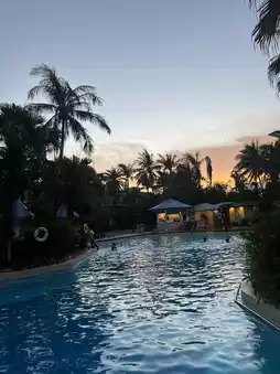 The outdoor pool surrounded by palm trees has a tropical resort atmosphere.