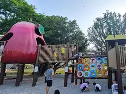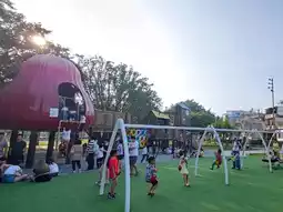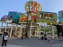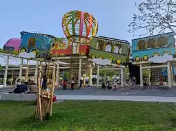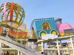 The park's highlight is its colorful, train-like structure that seems to fly, with vibrant tracks winding above the play area, as if carrying children's dreams into the sky. This flying train has become the park's iconic landmark and a must-visit photo spot for parents and kids, both during the day and at night. Surrounding the playground are lush green pathways, seating areas, and shaded facilities, providing a safe and relaxing environment for parents to accompany their children while enjoying the natural surroundings. This place is more than just a playground; it feels like a community-friendly park for families.