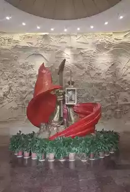 The exhibition building in the museum area has a majestic shape. The entire exterior wall is covered with light yellow tiles, the eaves are surrounded by golden glazed bricks, and the eight large characters "A single spark can start a prairie fire" are cast on the main walls on both sides. It is a landmark building in Pingxiang and a beautiful red business card.