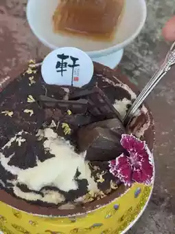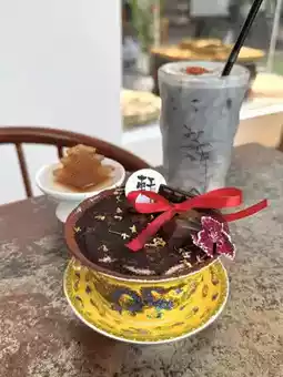 We tried their maotai tiramisu, which came in a bright yellow oriental teacup. The presentation alone was worth the visit—garnished with flowers and ribbon, chocolate chunks, and a sprinkle of coffee powder. You get a soft hit of maotai that’s surprisingly well-balanced with the creamy mascarpone. A little boozy, a little sweet, but overall very well put together.