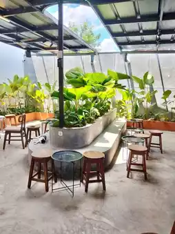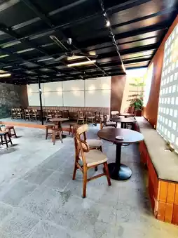 Beyond this area, the space opens up into a more defined seating zone with built-in low, terracotta-colored benches and small tables, perfect for groups. The ground here features a mix of gravel and manicured greenery, including small, decorative trees and a raised, circular garden bed.