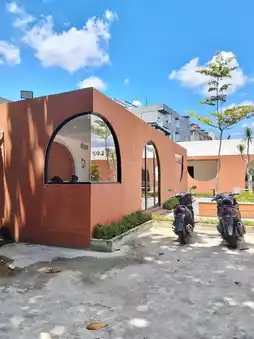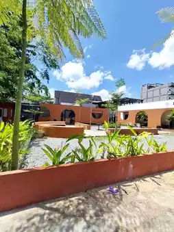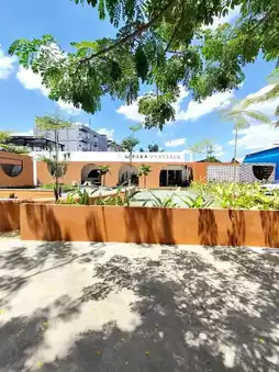 The bright sunlight indicates a midday or early afternoon setting, casting strong shadows and highlighting the rich texture of the walls and the glossy appearance of the leaves. In the background, there are hints of a larger, darker-colored structure, possibly the main building of the establishment, and a concrete-and-steel building beyond that, suggesting this stylish oasis is situated within a more urban or developing area. The overall impression is one of a serene, contemporary retreat—a perfect spot for a casual coffee, conversation, or simply enjoying the pleasant weather. It is a thoughtfully designed space meant to be a comfortable, visual escape from the typical city environment.