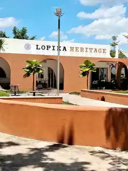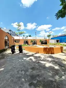 The central focus is the low-slung, white building with the name displayed prominently. Its architecture appears contemporary, featuring clean lines and possibly a minimalist aesthetic, punctuated by curved openings or alcoves. In front of the building is a large, semicircular planter or seating area made of an earthy, terracotta or reddish-brown colored material. This color palette—the warm brown tones contrasted with the crisp white structure and the vivid blue sky—gives the area a bright, almost Mediterranean or tropical feel. The use of curved forms in both the building's facade and the foreground structure softens the look and encourages a relaxed atmosphere. The contrast between the paved, sun-drenched concrete ground and the warm-toned architectural features is stark, creating interesting shadows that hint at the time of day.