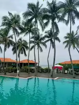 The poolside, lined with swaying palm trees, offered another layer of paradise. Whether you’re swimming or simply enjoying the view, the lush greenery combined with the sea in the background creates an incredibly serene atmosphere.