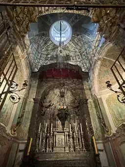 The Porto Cathedral (Sé do Porto) has an exterior that exudes a fortress-like sturdiness, while its interior features a Baroque-style altar adorned with gold and an impressive rose window.