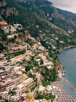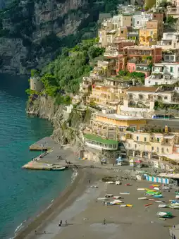 Looking down at the coastline of Positano, white parasols and red buildings shimmer brilliantly under the Mediterranean sun.
