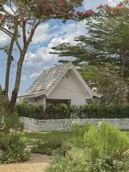 Surrounded by nature, you'll find views of trees, mountains, and a colorful flower garden. The cafe is decorated with woven bamboo structures.
